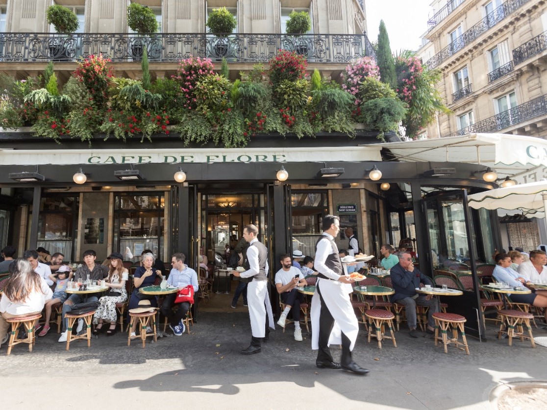パリにはテラス席を用意した多くのカフェがあり、人々の日常に溶け込んでいます。「カフェ・ドウ・フロール」は、1887年創業の老舗カフェ。かつて詩人のアポリネールなど多くの文学者が集った場所としても有名で、現在はモード関係者、映画関係者たちが多く通います。いつも賑やかなテラス席は、左奥のテーブルが常連客の特等席とか!外観の草花もおしゃれな雰囲気を醸し出しています。