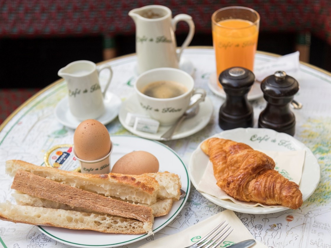カフェで朝食を楽しむのも、パリジェンヌ風の過ごし方です。定番メニューはクロワッサンにゆで卵、コーヒーとオレンジジュースなど。センスの良いイラストの描かれたテーブルクロスもかわいいので、ぜひ写真におさめて。