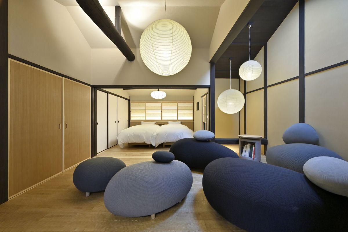ベッドルームと和室をつなぐラウンジスペースには「トラフ建築設計事務所」がデザインしたユニークな丸型ソファがまるで石庭のように設置されています。