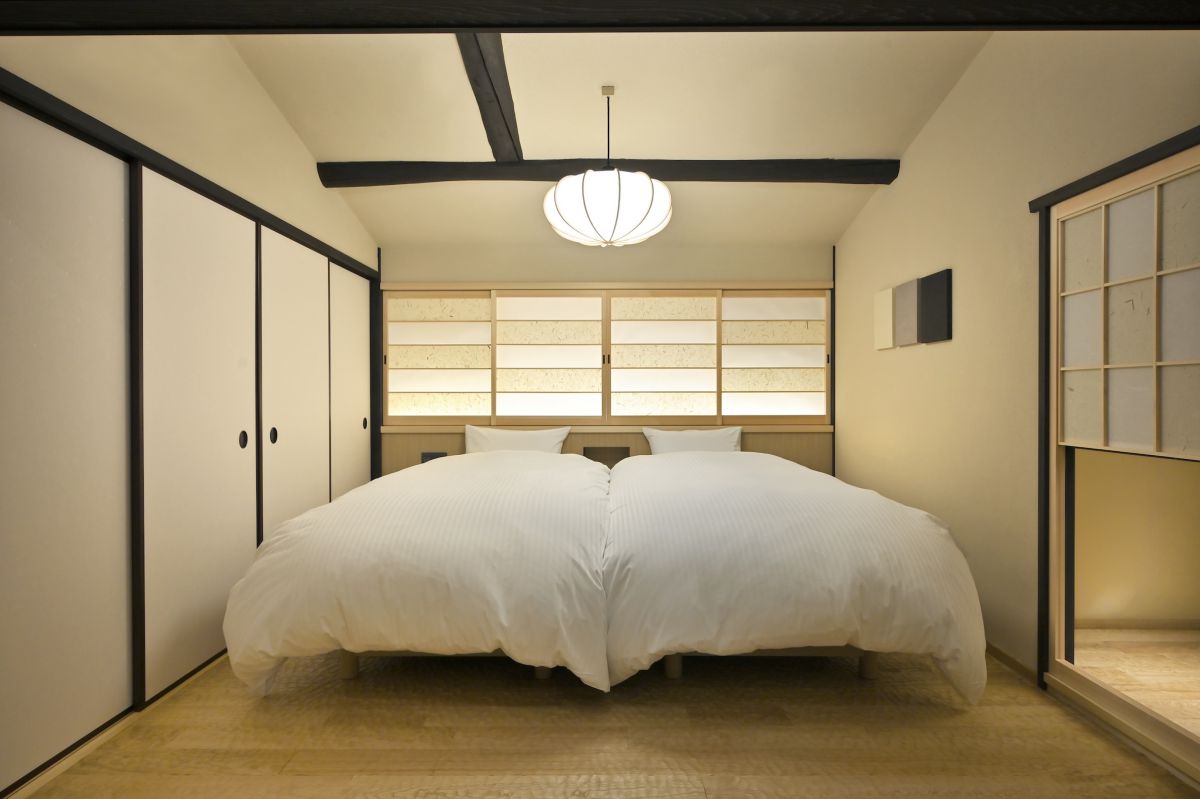 ベットルームとラウンジスペースを仕切る襖(ふすま)を開けると、ひと続きの部屋のようになり、旅の時間と空間を仲間と共有することができる、ゆったりとした設計。