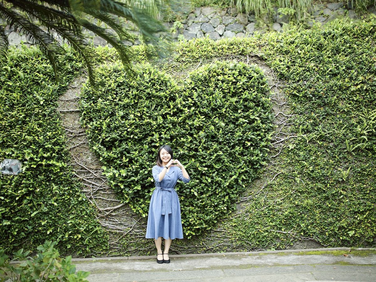 入り口にある名物のハートリーフ。来場者のみなさんに喜んでもらいたいという思いから、庭の植え込みをハート型に剪定したものなのだとか。近くの大学に通う女子大生の口コミから人気に火がつき、今では結婚式の前撮りや観光客、修学旅行生なども訪れる話題の撮影スポットです。