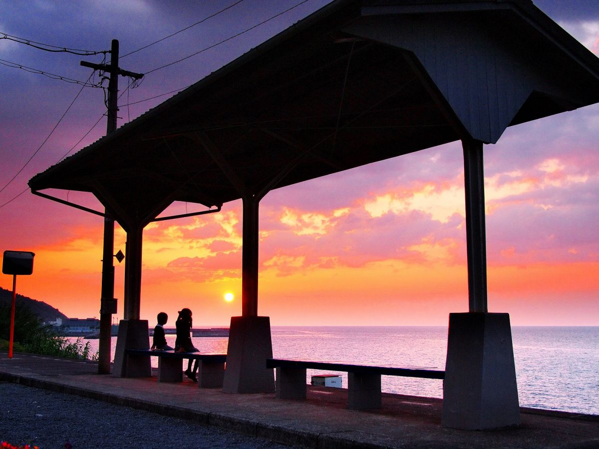夕暮れに訪れた場合は、こんな美しい風景も!夕日に照らされた海が、茜色に染まる景色にうっとり。美しい夕日と、昔ながらのホームが絵になりますね。