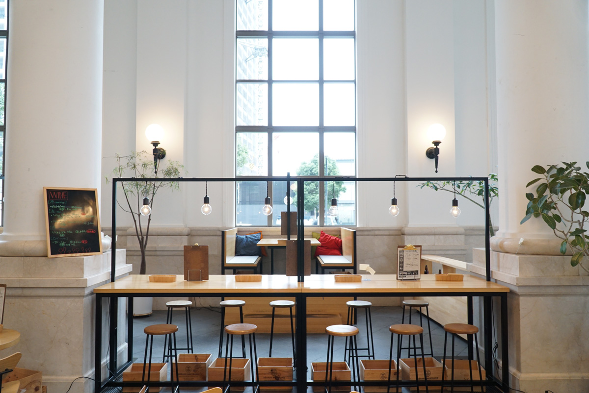 みなとみらい線馬車道駅1b出口直結の好アクセスな場所に「カフェ オムニバス」はあります。1929年に建設された「旧第一銀行横浜支店」を一部移築復元した歴史的建造物を活用した施設の1階にある同店は、トスカーナ式の柱と教会のようなアーチ型の窓を配した広々とした空間がとても印象的。