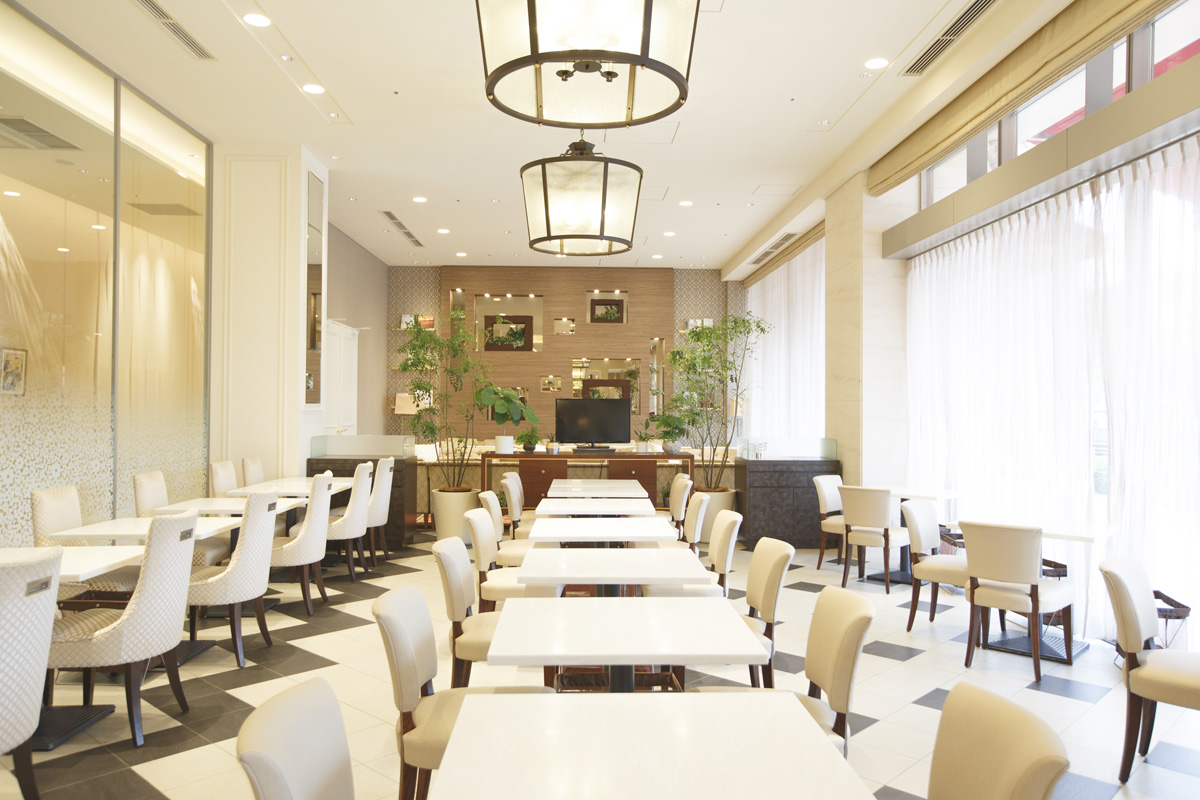 白を基調とした店内は、川側が全面ガラス張りで、どこの席でも抜けるような開放感。テーブルが広く隣の席との距離が保たれているので、各々の会話が楽しめます。ウェディングのノウハウを生かしたきめ細やかな接客や空間作りで、心地よく寛げます。