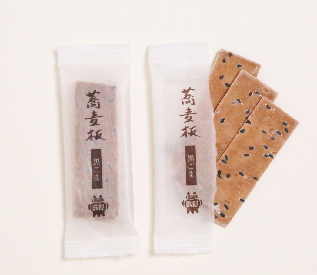 詰め合わせに入った蕎麦板は、菓子屋と蕎麦屋の顔を持つ『尾張屋』ならではのお菓子。蕎麦を打つように生地を薄く伸ばし、短冊状にしたものを一文字釜でかりっと焼いた、香ばしいお菓子です。
