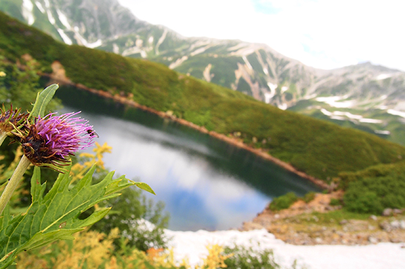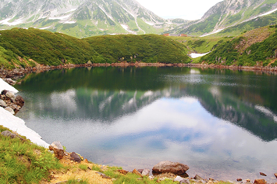 青い水の中に、立山の山々が映る「みくりが池」の姿は、マストで撮影しておきたい場所。風がないときには、くっきりとした「逆さ立山」をみることができますよ!