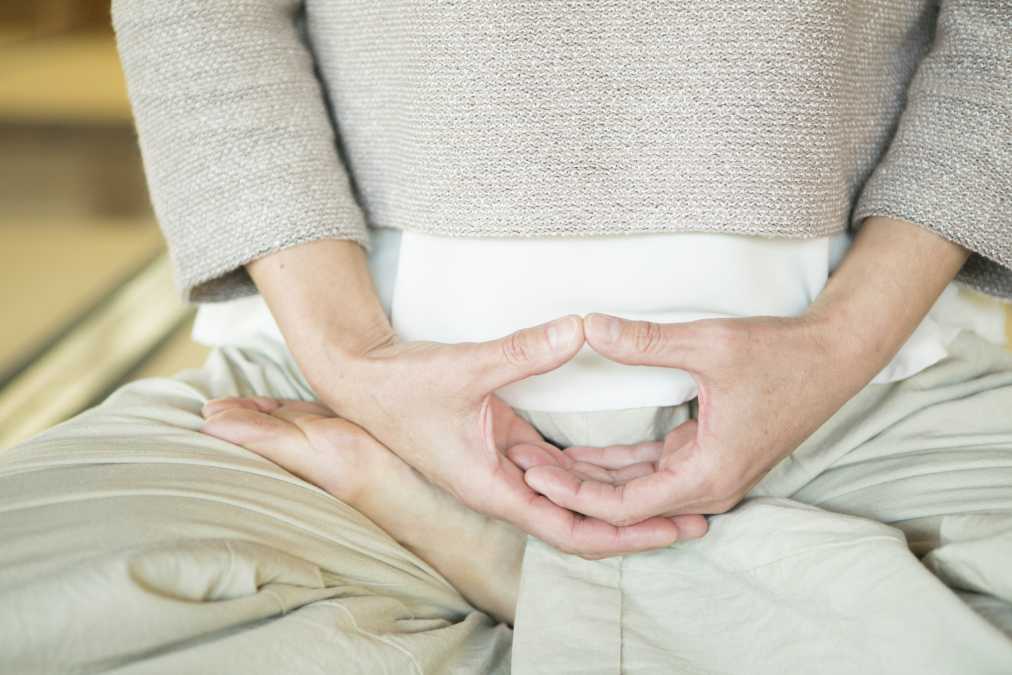 坐禅をする際は、左右の足をももの上にのせる「結跏趺坐(けっかふざ)」、または片足だけをのせる「半跏趺坐(はんかふざ)」という足の組み方で座ります。手は、右手の上に左手を重ね、親指同士が軽く触れる程度にくっつけて、きれいな円をつくります。