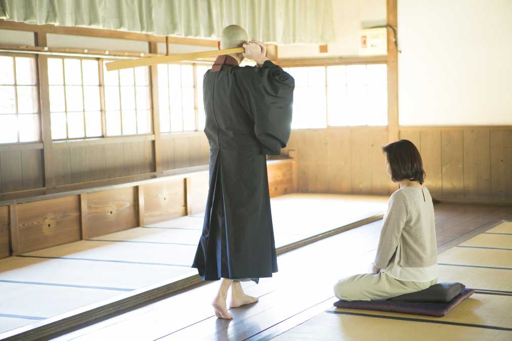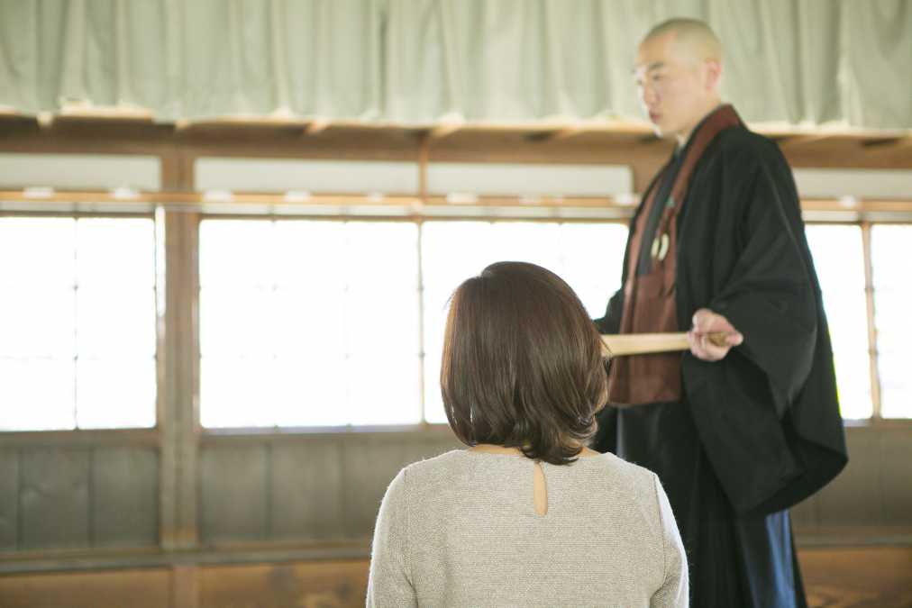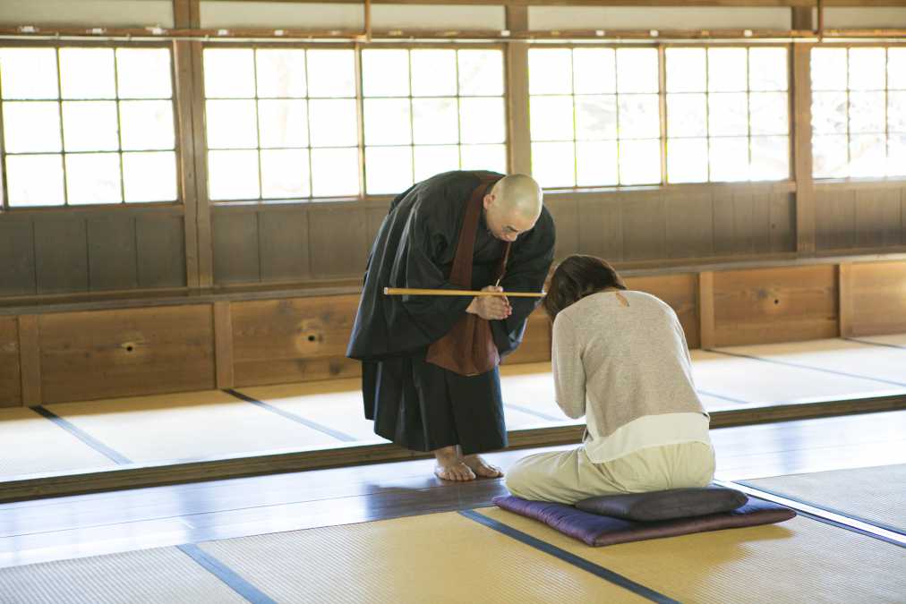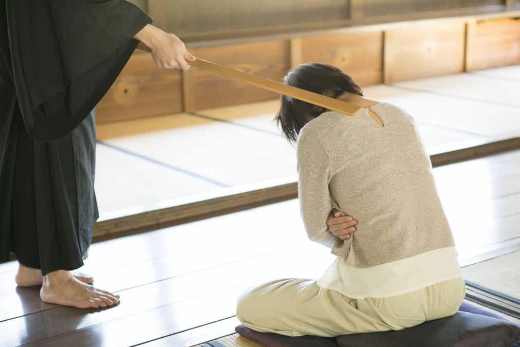 坐禅中に和尚さんが肩を叩く棒は「警策(けいさく)」といって、修行者の精進を励ますためのもの。集中できなかったり、睡魔に襲われたときなどは、自分から警策を求めることもできます。座ったまま合掌をすれば、「警策を打ってください」という合図になります。ちょっと痛いですが、気持ちが引き締まり、集中しやすくなります。