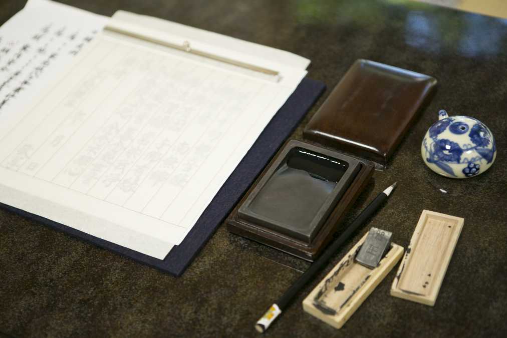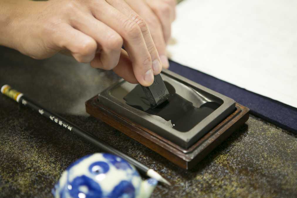 まずは、硯で墨をすります。静かな空間でただひたすら墨をする…。なんでもないことのようですが、ふだんの生活の中にはない作業をするだけでも、なんだかとってもありがたい気持ちになります。