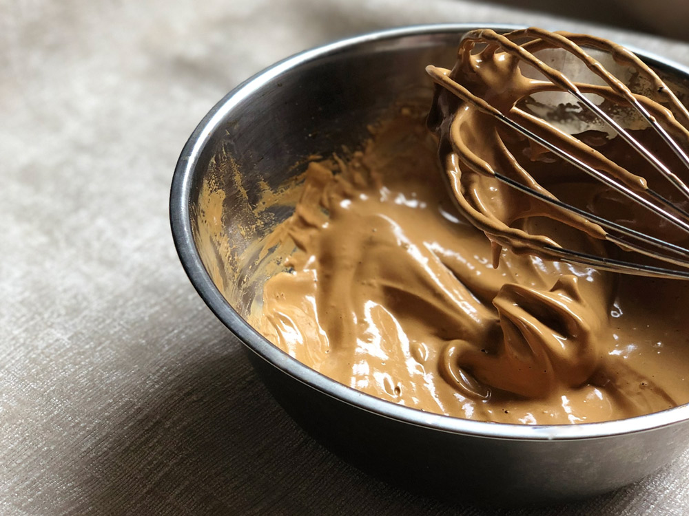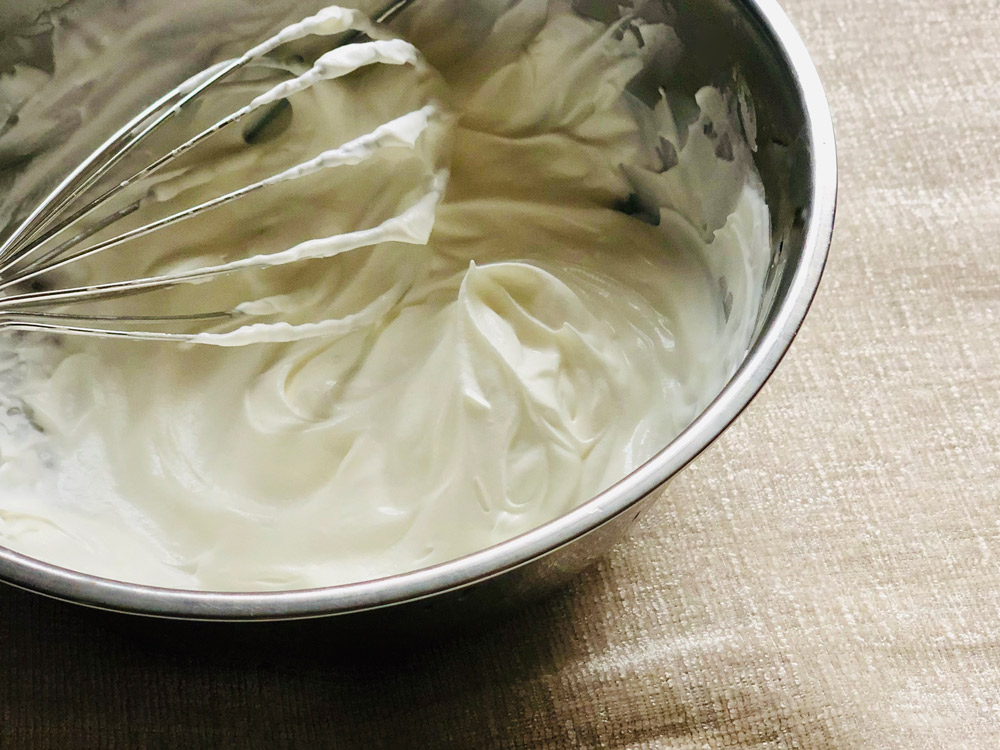 カラメル色になりツノが立つまで混ぜればふわっとしたクリームに。空気を含ませながら混ぜるのが早く泡立てるコツです。電動フォーマーがあれば楽ちん。