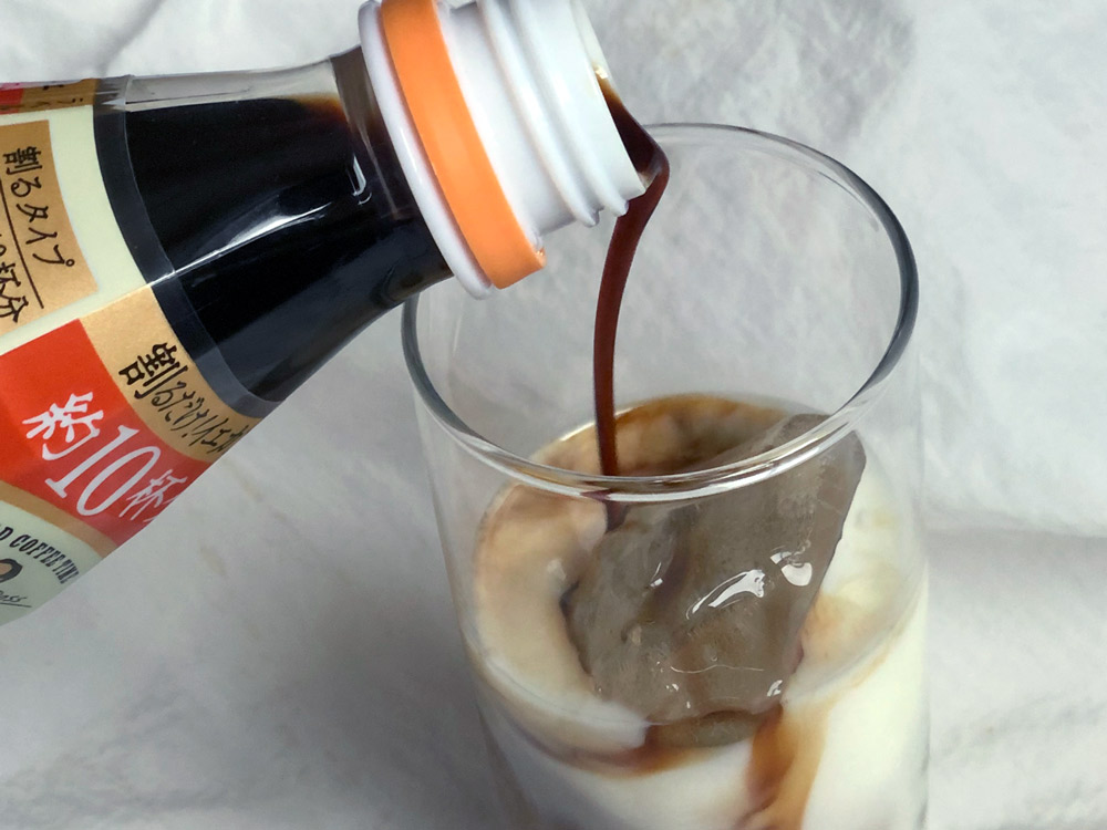 ③コーヒーまたはラテベースを氷にあてながら2割注ぎます。