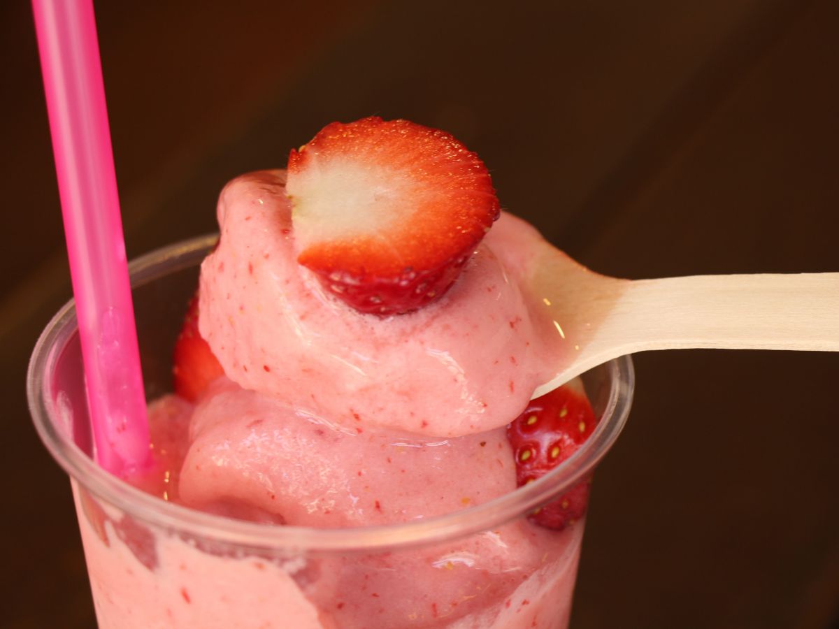 新鮮な状態でいちごを凍らせることで、果物の旨みが凝縮され、いちごをそのまま食べているような味わいです。溶けてきたら、ストローで飲んでみてくださいね。濃厚なジュースのようで、これもまたおいしいのです!