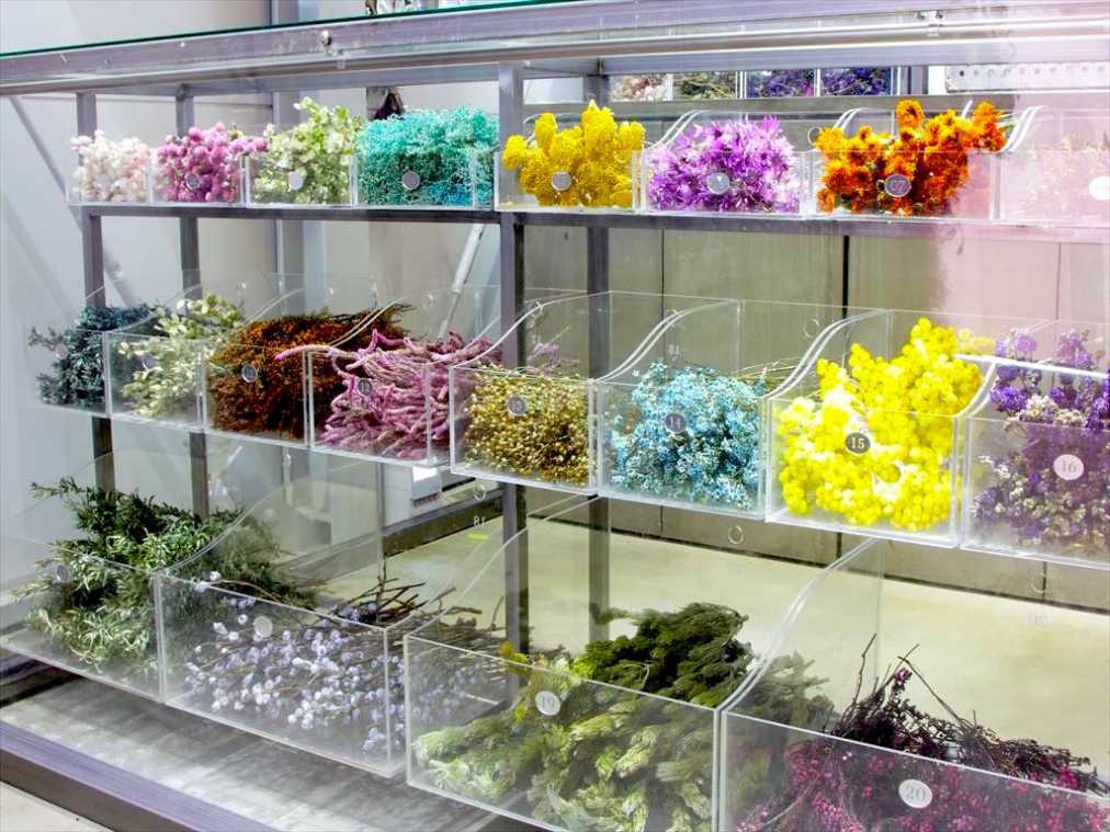 店内には常に20種類ほどのドライフラワーが並んでいます。単に乾燥させるだけではなく、色を染み込ませたり、カラースプレーで着色しているものなどバリエーションも豊か。