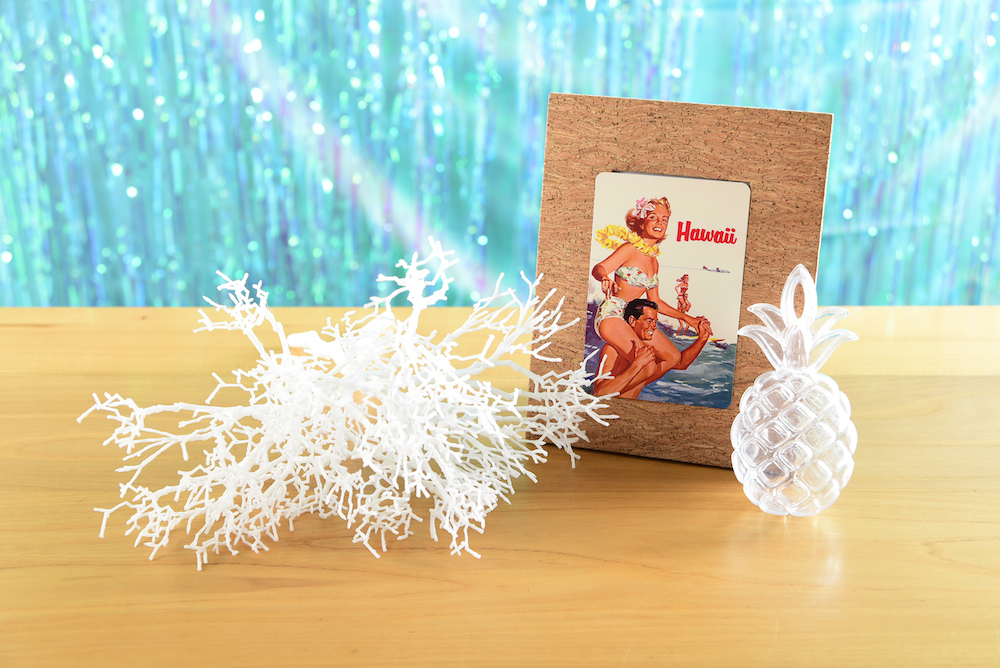 ハワイの海の中をイメージして、ファブリックやお皿に水色やエメラルドグリーンを配し、爽やかな統一感を。サンゴやパイナップルの雑貨、レトロな絵など、細かい部分ももちろんハワイを意識。ハワイ土産でもらったお菓子の入れ物などを飾っても雰囲気が出ます。