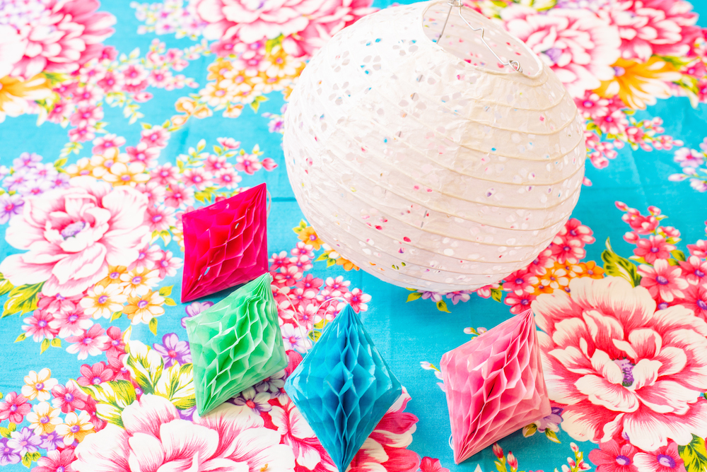 ひと目で「台湾」だとわかる台湾花布は、クロスに引くだけでバチッと絵になる便利アイテム。パーティーの飾り付けの常連・ハニカムボールは、メジャーな丸形のほか、どこか台湾らしさを感じる蜂の巣をイメージしたものも用意して、遊びゴコロを演出してみて。