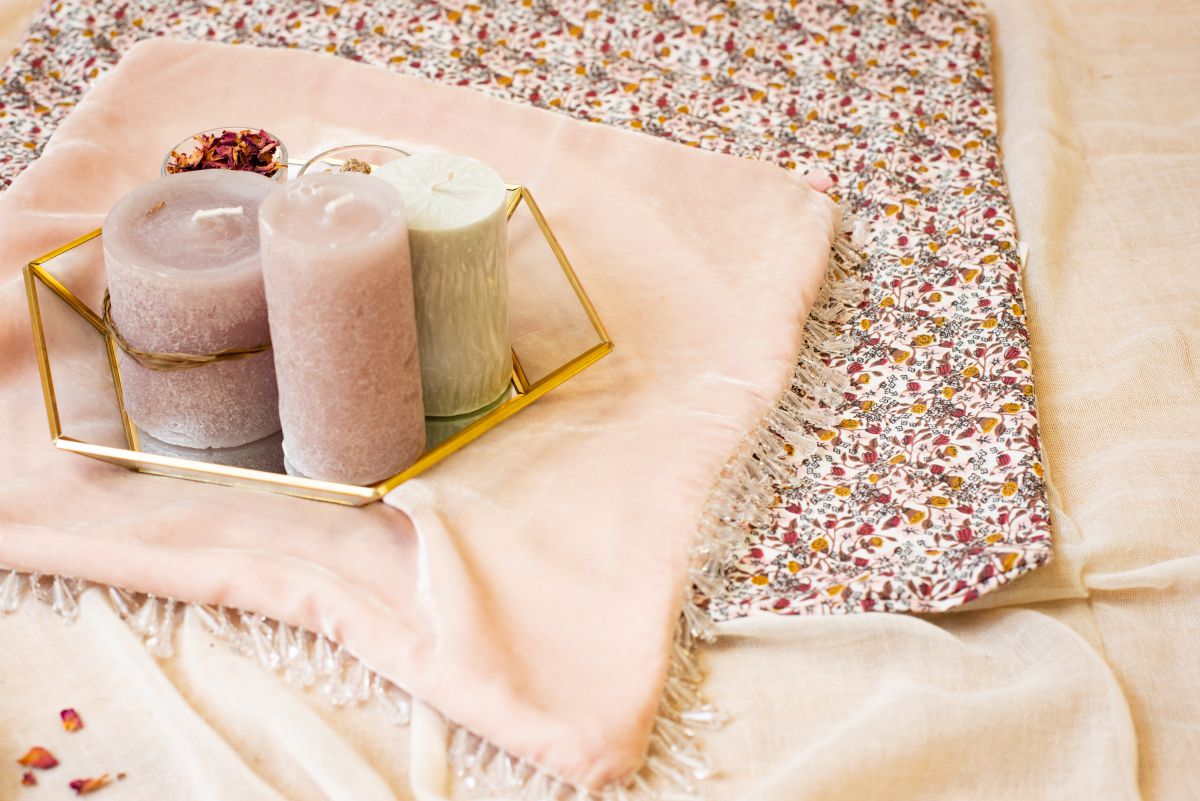 テーブルに敷いているのはアジア雑貨店で手に入れたペイズリー柄のピンクのストール。あえてストールを選ぶことで、柄やイメージに選択の幅が広がるのでオススメです。温かみのある木の器や金の器は300円ショップや輸入雑貨屋さんなどのプチプラアイテム。相性のいい色味のドライフラワーなどをあしらうと、一層華やかな印象になります。