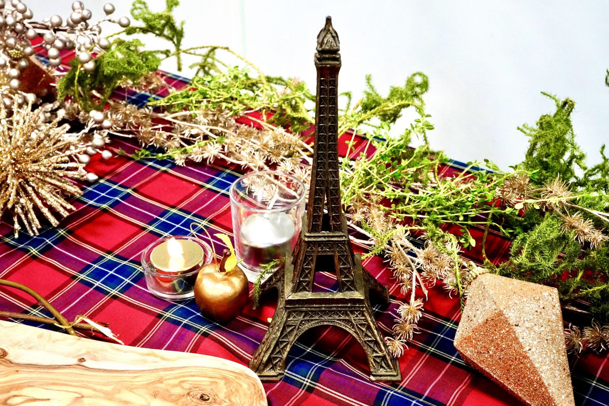 赤と深緑のチェックの布を引くと、温かみのある雰囲気が出ます。カトラリーも光沢のあるものを選び、全体的にカラフルなものよりも、赤や金をキーカラーとしてまとめると、大人っぽい空間に。グリーンや、エッフェル塔のオブジェなどフランスっぽい雑貨をさりげなく置くのも、シンプルになりすぎず、おしゃれ!
