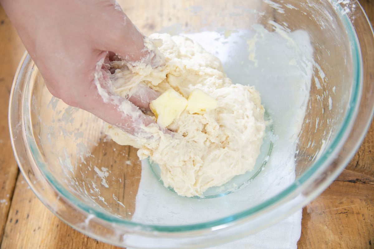 ボウルに粉を入れ、塩、砂糖、イーストを入れて混ぜておく。ぬるま湯をそそぎ全体を混ぜ合わせ、ひとかたまりになったらバターを加えまとめ、まな板の上でこねる。