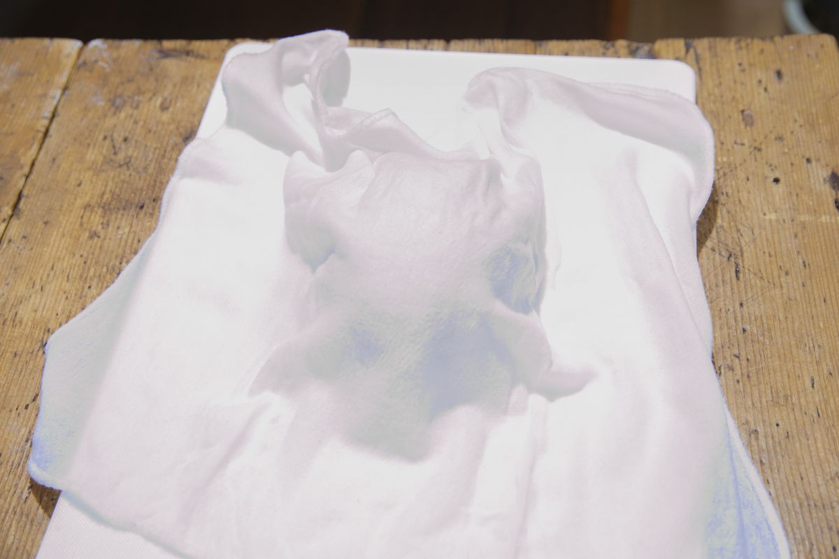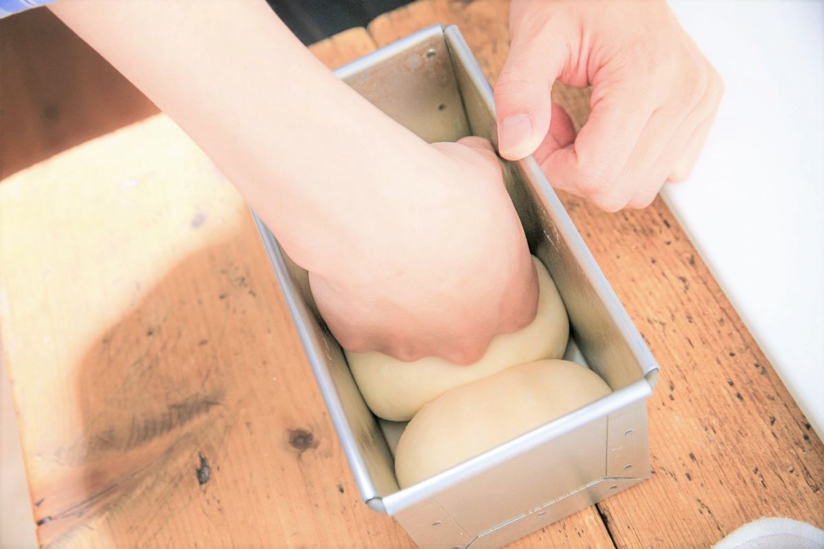 生地をたたいて平らにし、丸め、とじ目を下にして食パン型に入れ、ぬれ布巾をかける。