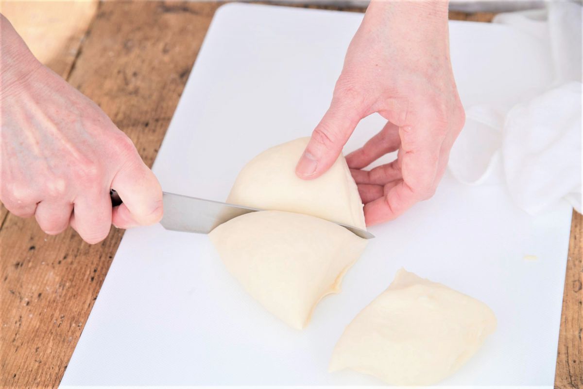 こねあがった生地を丸めたものを3等分し、それぞれを再び丸め直した後、ぬれ布巾をかけて5分間生地を休ませる