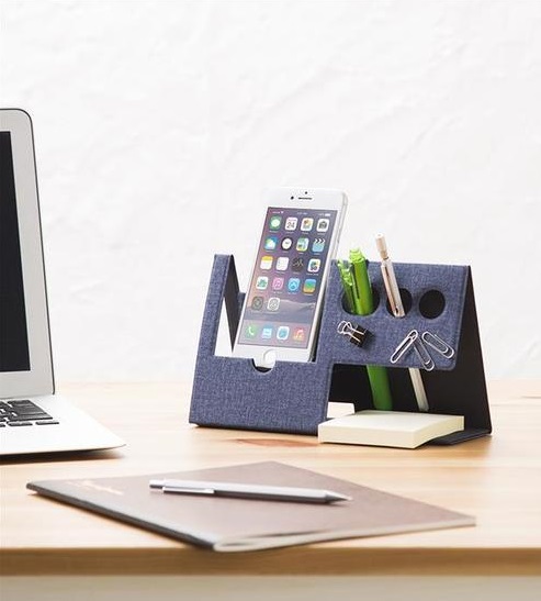 組み立てるとペンホルダーやブロックメモ、クリップ置きにもなる新感覚グッズ「オリパクト デスクオーガナイザーM(ナカバヤシ)」2310円。充電しながら使えるスマホスタンド付き。