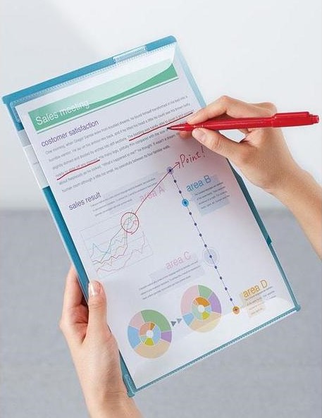 「カキコホルダー(キングジム)」A4:231円・A3:330円は、クリアファイルとボードが一体化。上下の透明なフラップで書類を挟み、ホルダーに入れたまま、立ちながらでも安定して書き込みができるがファイルです。使わない書類はクリアファイルに収納しておけばOK。