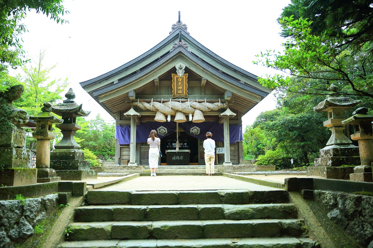 美しい白兎海岸添いへ車を走らせ、向かったのは白兎神社。『古事記』に記される神話「因幡の白うさぎ」 に登場する、白兎神を祀る由緒ある神社です。大国主命と八上姫の恋のキューピッドとなった神様で、縁結びのご利益で有名。日本のラブストーリー発祥地とされ「恋人の聖地」としても人気なんです。
