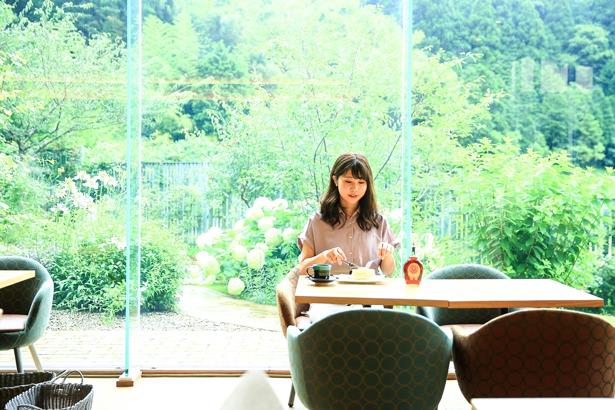 今回のお目当ては、ココガーデンで味わえる評判のパンケーキ。自社牧場で平飼いした鶏が生む「天美卵」を使い、1日1500枚焼くこともあるという人気スイーツとあってわくわくです!