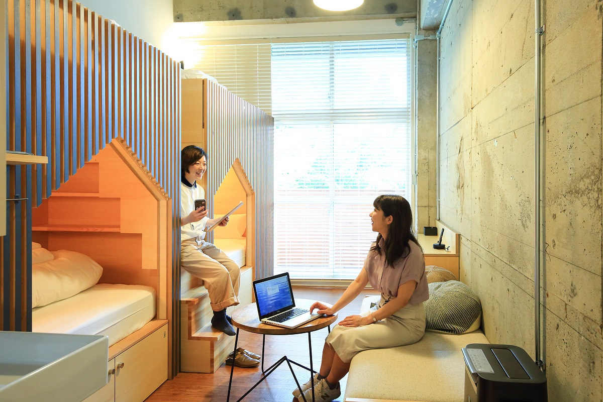 館内は、日本の伝統をテーマに、伝統技法や地元の木材、民藝品などを取り入れて改装。個性豊かなデザインで、全31室とドミトリーがあります。客室にはテレビがないので、静かな時の流れが感じられ、仕事にも身が入りそう。