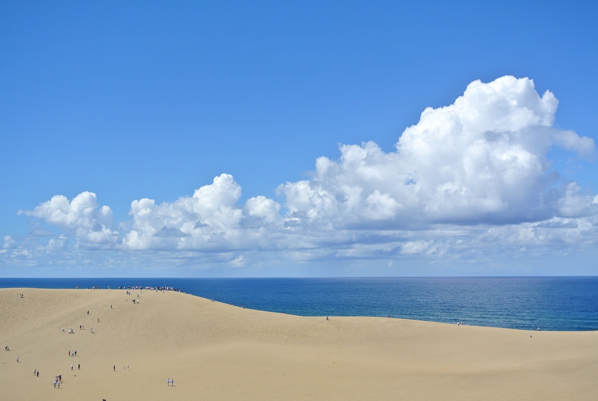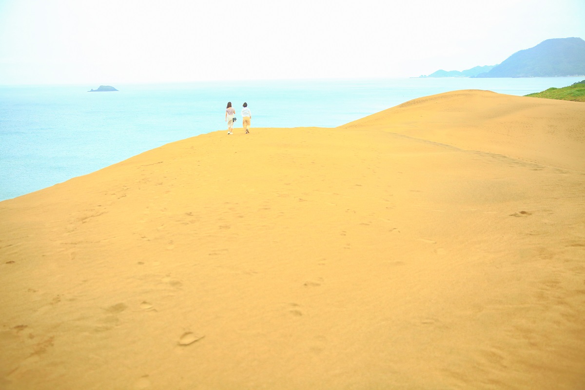 市街地から車でたったの15分。お仕事タイムからあっという間にこの絶景を目にすることができるなんて感激です。目の前に広がるのは、一面の砂の世界と青い海と空!急斜面の「馬の背」にのぼって日本海を眺めたり、地下水が湧くオアシス添いを歩いたり。その時にしか見られないドラマチックな光景を目に焼き付けて。