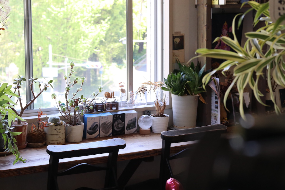 雑居ビルの一室とは思えない、緑と木のナチュラルな雰囲気に包まれた店内。あちこちに置かれた植物は、それぞれが自由奔放に育っていて、気持ちがよさそうです。