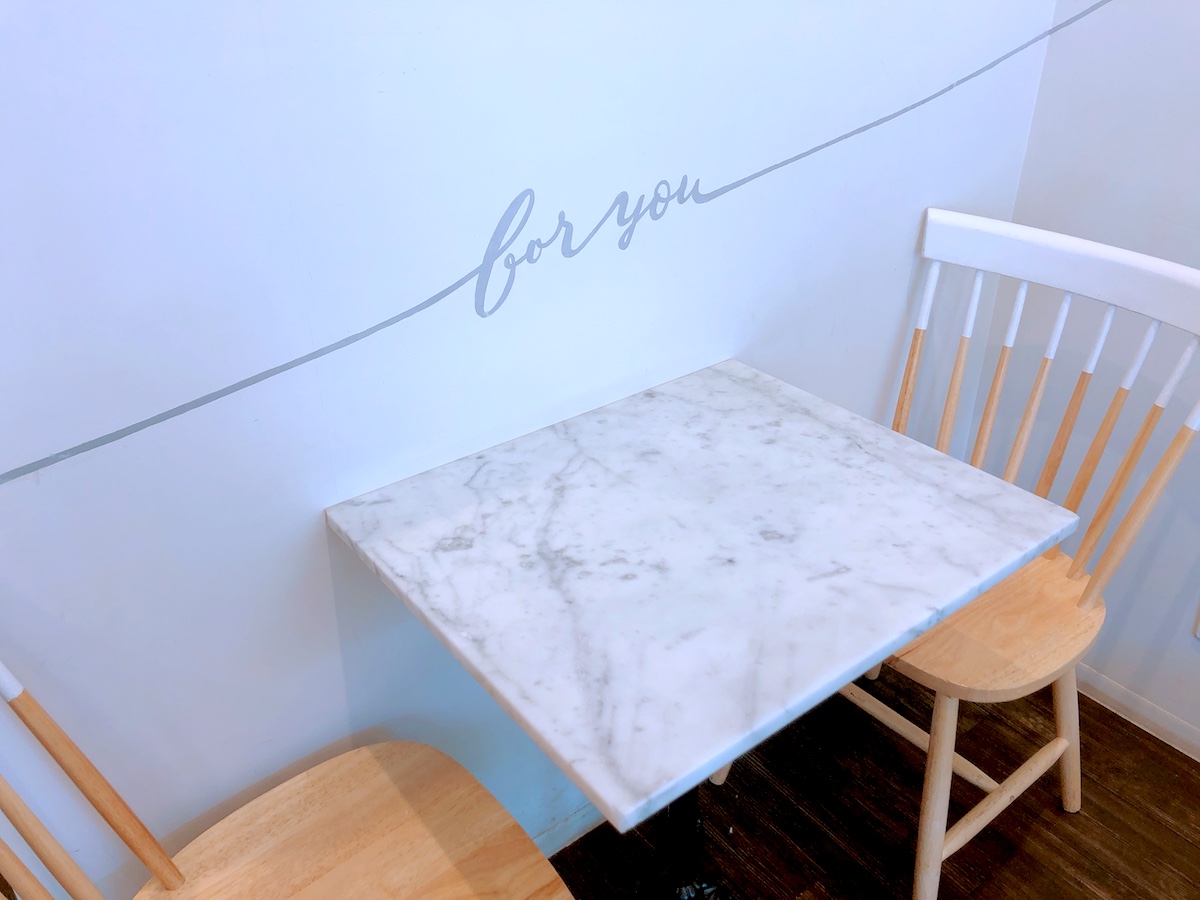 白とパステルグリーンを基調とした店内は落ち着いた雰囲気。大きな窓からの日差しを浴びながら、ゆっくりとした時間が過ごせます。壁にはお店のコンセプトである「for you」のかわいらしいロゴも。