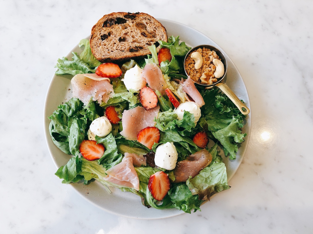 「foru cafe」の自慢はスイーツだけではありません!こちらはお店のオリジナル「苺とマスカルポーネ、生ハムのサラダ」980円(税込)。特徴はサラダにあわせて作られた甘じょっぱいグラノーラが付いていることです。