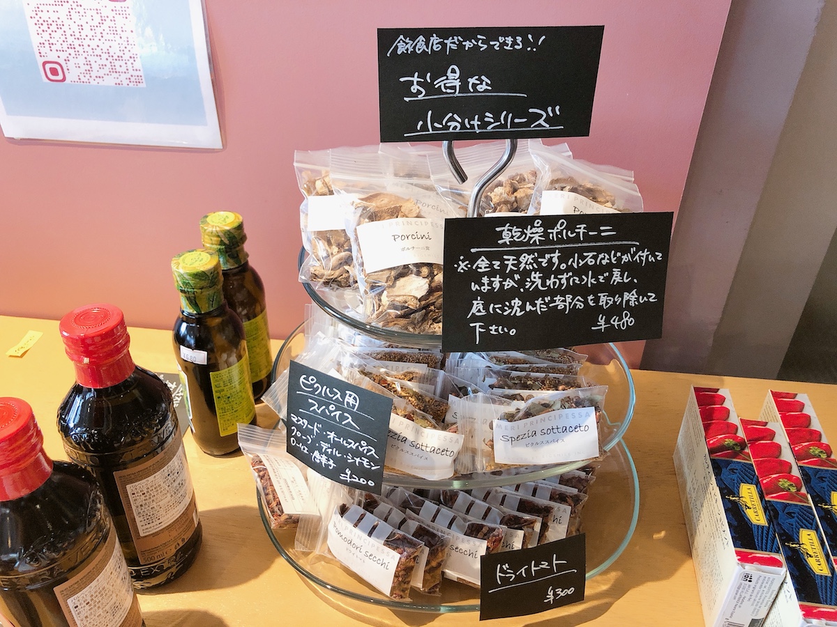 「スーパーでは売っていない上質なものを手軽に」をコンセプトに、普段なかなか見かけないオリーブオイルやトマト缶などを揃えています。レストランとして運営をしていた頃に発注していた専門業者の倉庫に足を運び、品質が良く、珍しい商品を厳選。業者から直接仕入れているため安くて良いものが手に入るとのこと。