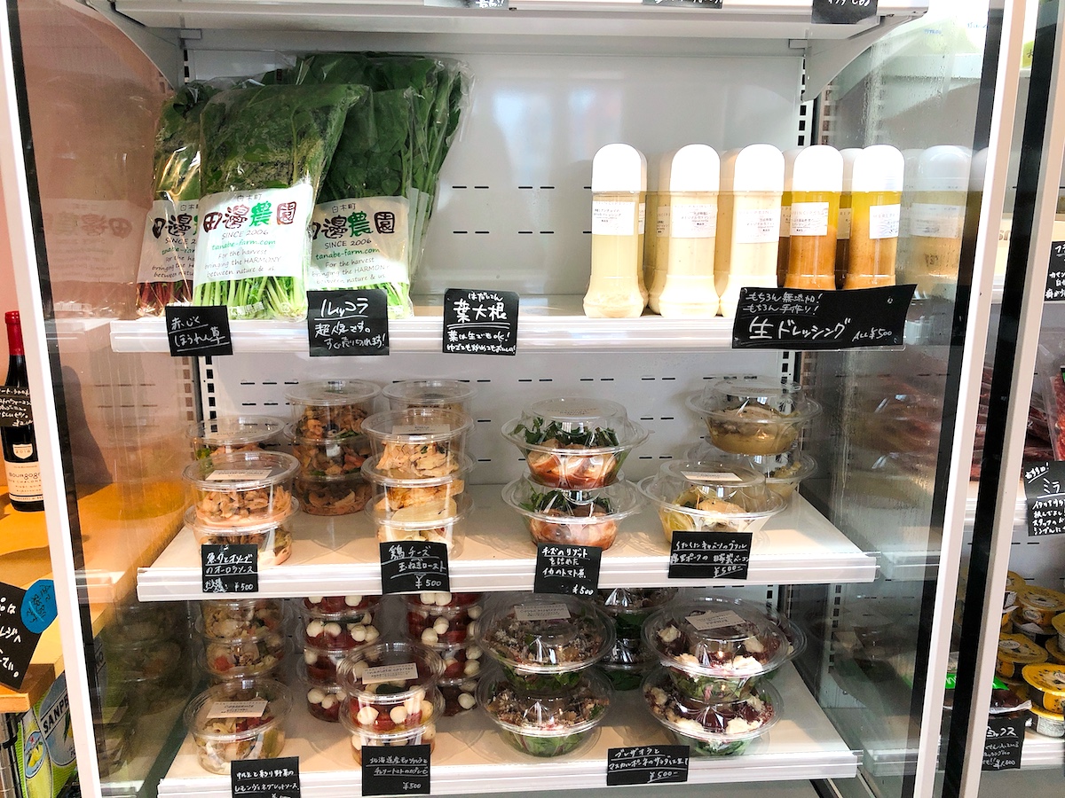 お店の奥のスペースではサラダやデリを販売。広島出身の社長がセレクトした地元の野菜やチーズを味わえます。イタリアンのシェフが国産やオーガニックにこだわって選んでいるため、味はおりがみつき。レストランの味をそのままおうちでいただけます!
