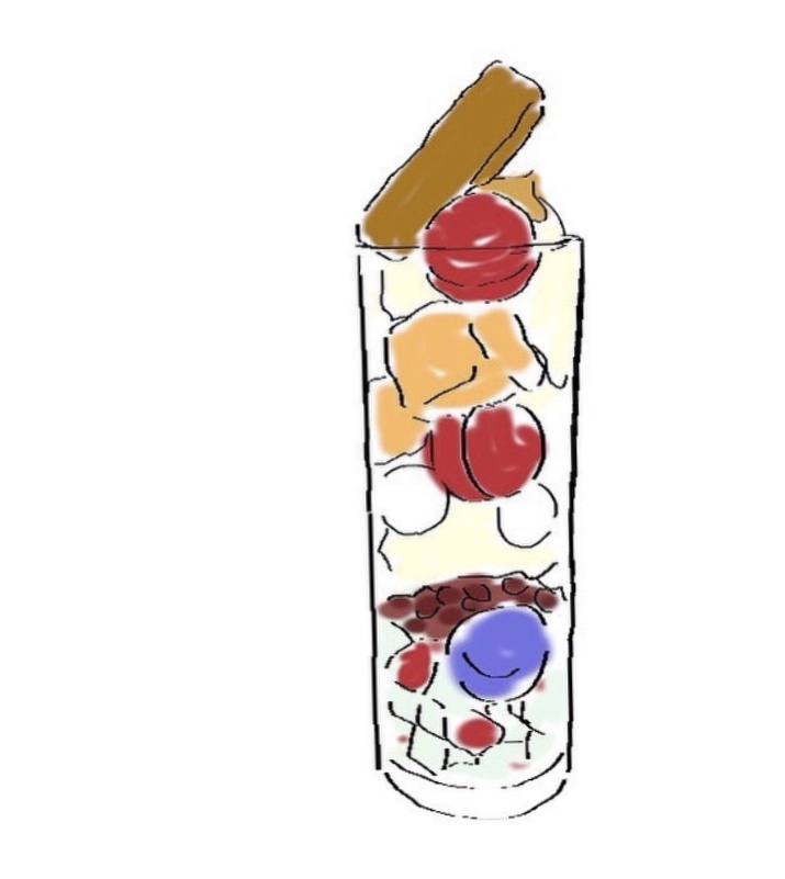 作品のイメージに合わせて、まるくて赤いフランボワーズの寒天やバニラアイスをシナモン風味のホイップクリームで味をまとめ、梅園おなじみの寒天や小豆も入れたあんみつパフェ。とってもかわいいです。
