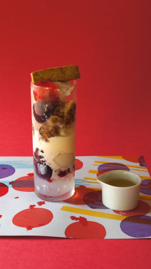 あんこといちごの相性のよさはいうまでもなく、ぴりりと山椒味のカカオシュトロイゼルやキルシュ入りの桜あん、焦がしカラメルの寒天などで、ほろ苦さやスパイスを加味した“大人”味のパフェです。