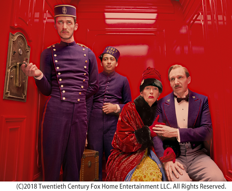 ホテルの外観は、ピンクの壁面にブルーの屋根。真っ赤な内装のエレベーターに、紫の制服に身を包むホテルマン。洋菓子店のショーウィンドウにディスプレイされたお菓子の箱まで女子力を刺激するデザインで、ウェス・アンダーソン監督の類いまれなる才能が随所に感じられます。
