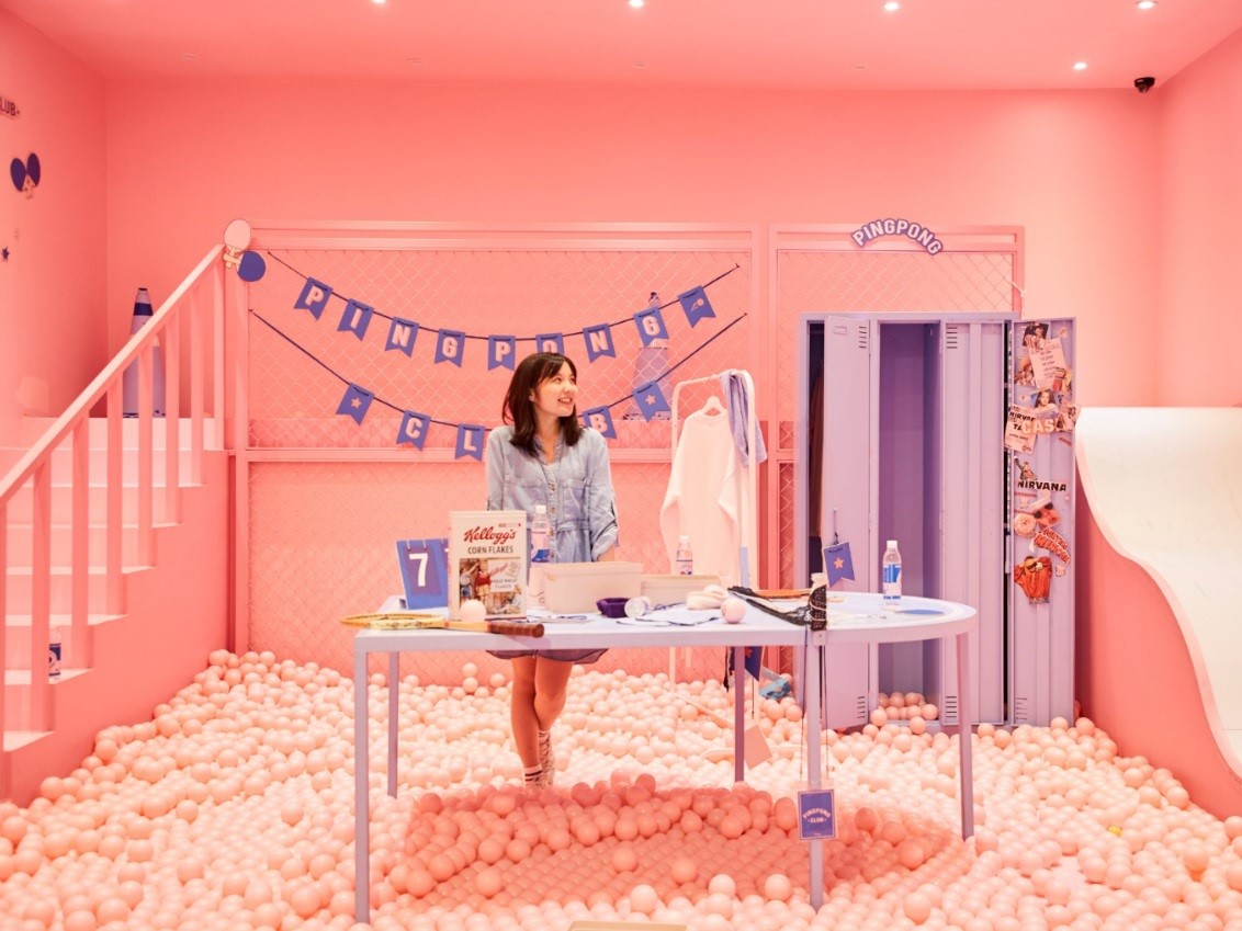 2階の最大の特徴は、かわいすぎる撮影スポット!ボールが敷き詰められたこのエリアは、「PINGPONG CLUB」とあるように、卓球クラブをイメージ。机の上に無造作に置かれた小物も雰囲気を演出しています。目線を外して、インスタグラマーを気取って撮影してみましょう!