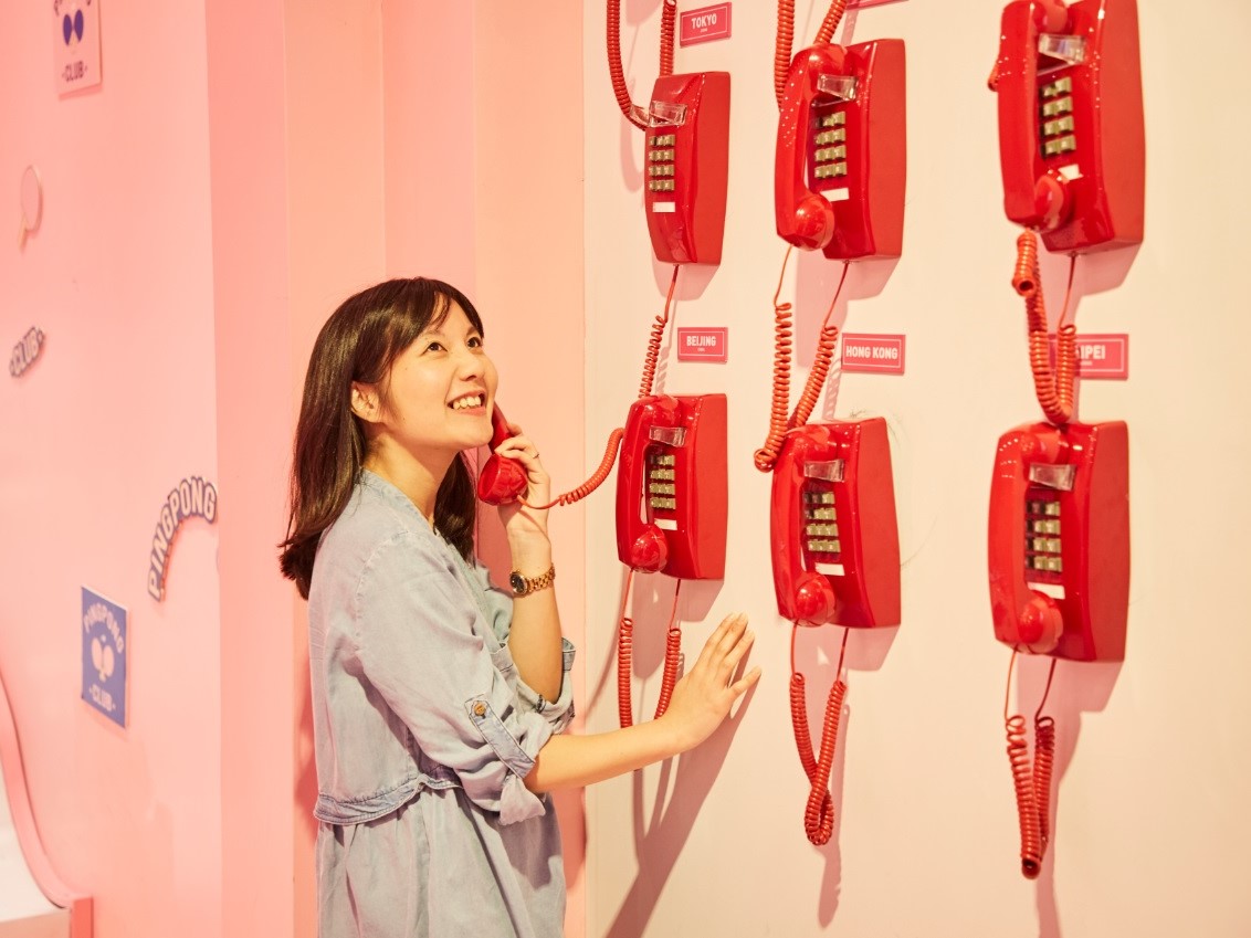 今度は壁に電話機がたくさん並んでいる場所を発見。それぞれの電話機の上に、世界の都市名が書かれていて、受話器をとればその都市に繋がる…なんてことを想像して楽しめます(編集部は真っ先にTokyoを手に取りました)!真っ赤な電話機がかわいくて、写真映えも最高!