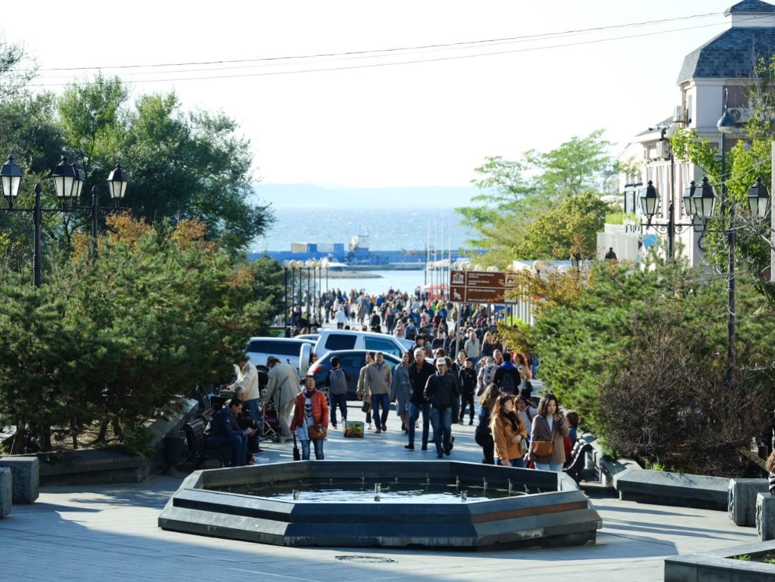 日本から一番近いヨーロッパといわれるウラジオストクは、西洋の香り漂う、絵になる街並みがいたるところにあります。写真の噴水通りは、左右をヨーロッパ風の建物に囲まれ、ビーチに向かって真っすぐに延びる人気エリア。空抜けが気持ちよく、週末にはライブやダンスパフォーマンスなども盛んです。
