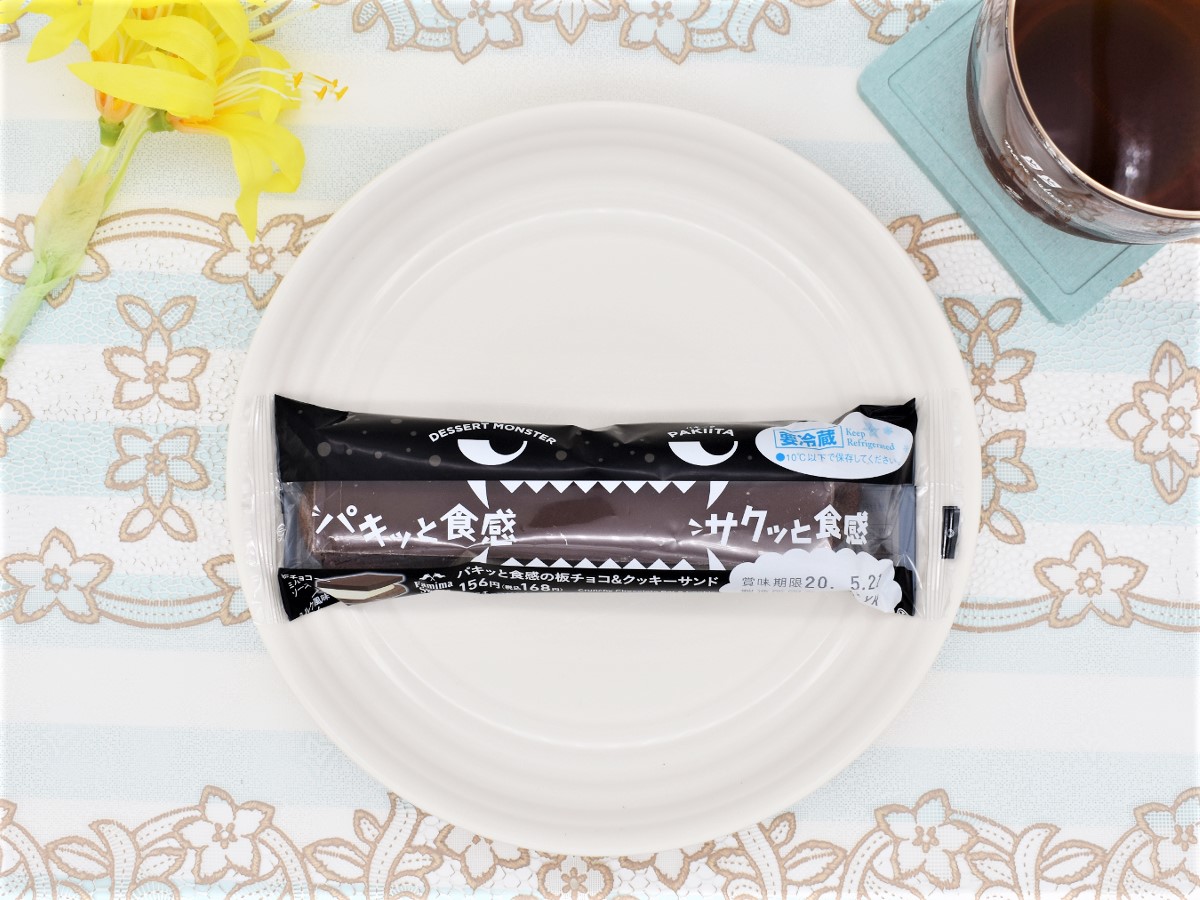「デザモン」シリーズは、食感に特徴があるワンハンドタイプのデザートを楽しめるみたいです。さっそくキュートなパッケージからクッキーサンドを取り出して、いただいてみましょう。板チョコとクッキーの間には「ミルク風味クリーム」がサンドされていますが、一口食べると“パキ&さく食感”を楽しめました。2種類の食感を同時に楽しめるのがクセになってしまい、ぱくぱく食べられます。