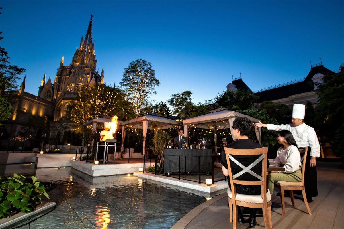 『Garden Restaurant in STRINGS』が開催されている2つのホテルのレストランを紹介します。『ストリングスホテル 名古屋』の中庭「カバナガーデン」は、大聖堂を臨むリゾート感あふれる空間。水辺で心地よい風に吹かれながら、心地よい時間が過ごせます。