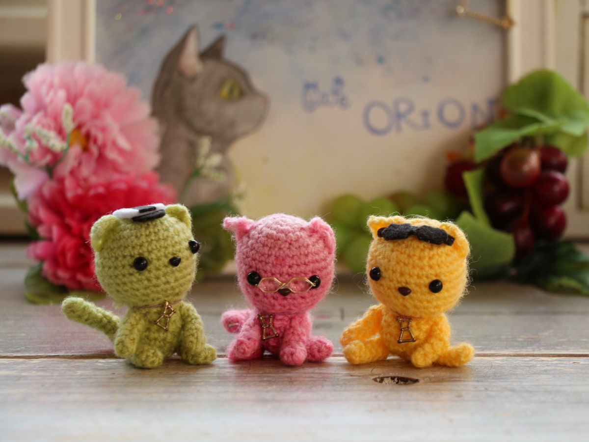 このかわいいぬいぐるみたちは、お店をイメージしてお客さんが作ってくれたカフェのオリジナルキャラクター「オリオンのニャンズ」。人形を持ってきてなくても、ニャンズたちと写真を撮ることができます。