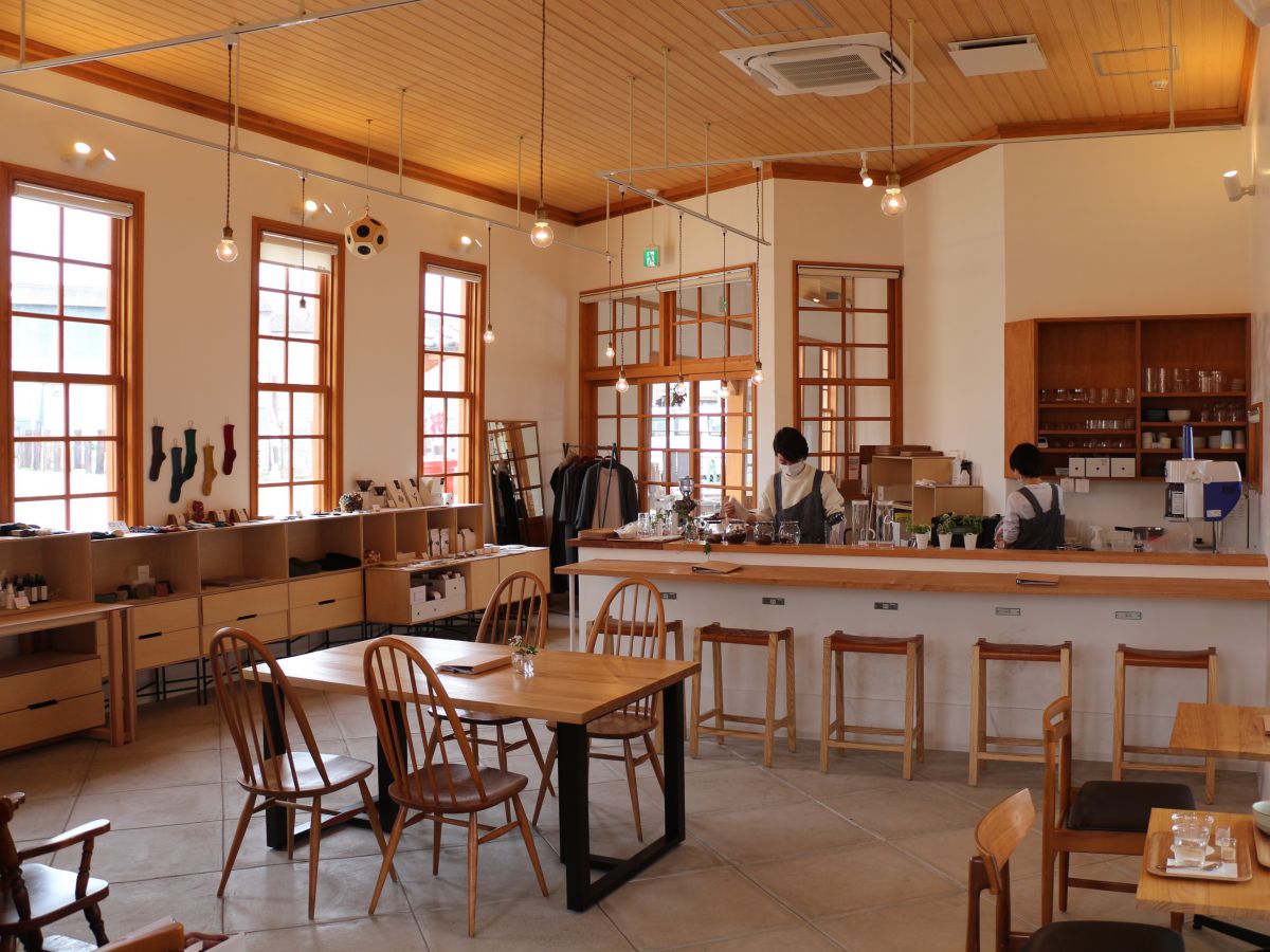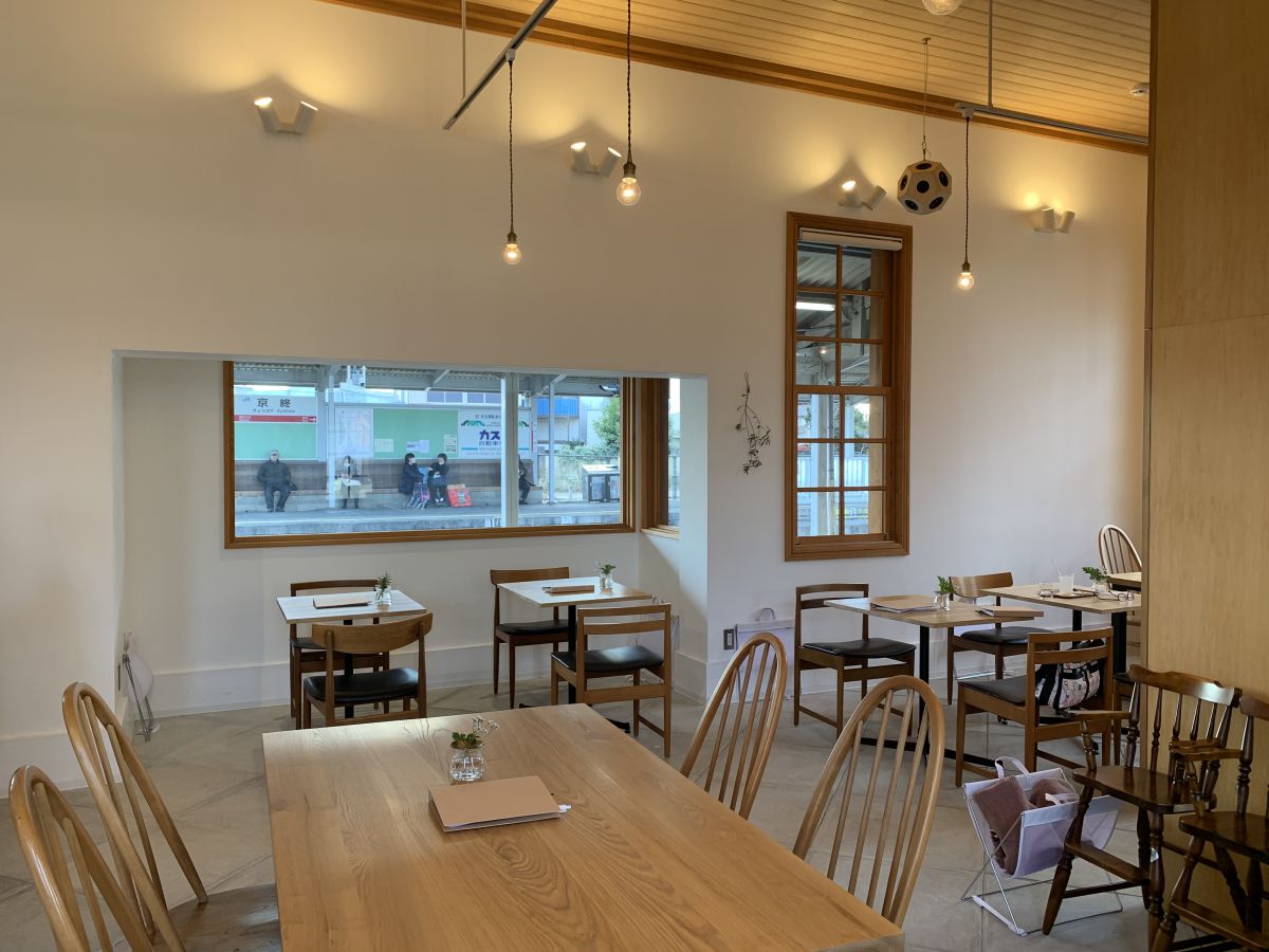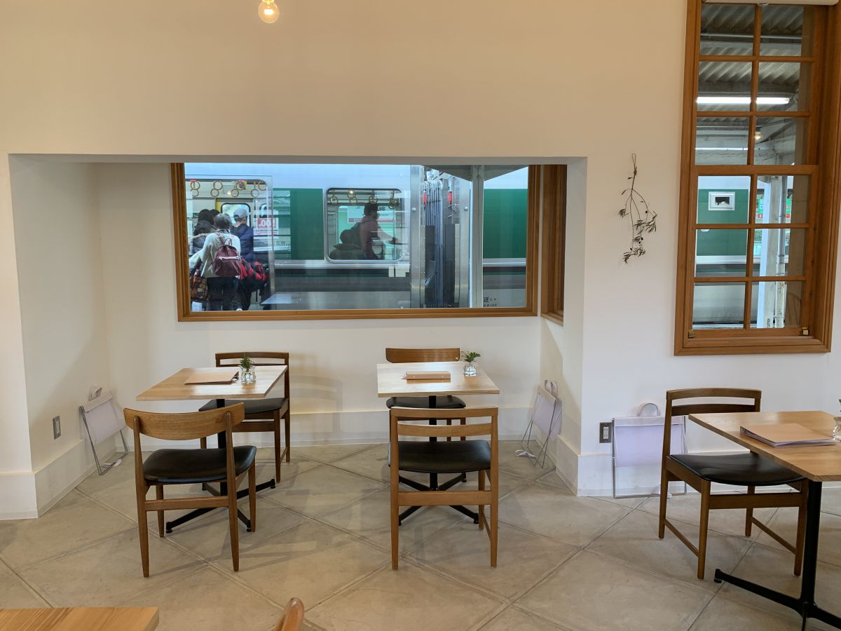 駅舎に入ると無人改札の横にカフェの入口があり、店内は明るく広々としています。白い壁に木枠の窓の向こうは京終駅のホーム。行き交う電車や乗り降りする乗客の姿を眺めていると、遠くの街に来たようで、時間の流れがゆっくり感じられます。