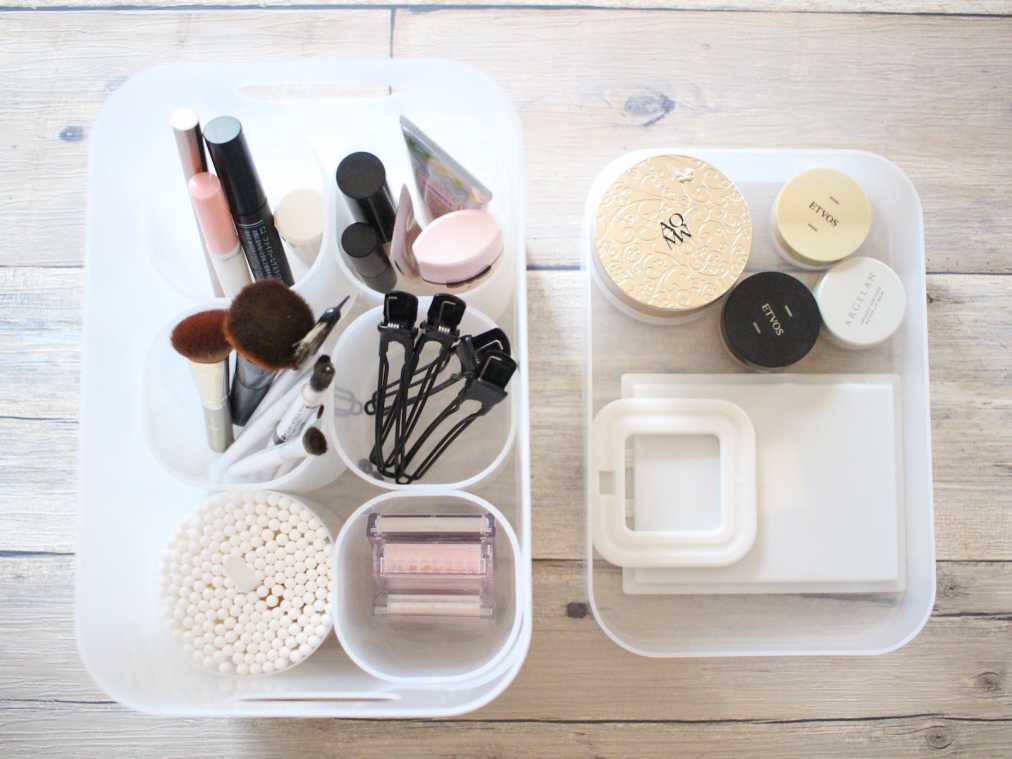 ドレッサーの中でごちゃごちゃしてしまいがちなコスメやメイク道具は、クリアボックスに入れて収納すると取り出しもスムーズ。