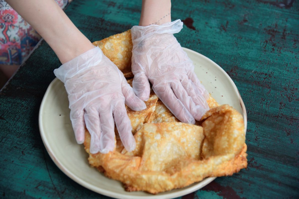 ふわっふわに膨らんだ揚げたての状態でサーブされるので、膨らみを押しつぶしてぺちゃんこに。平たくなった生地をロール状にくるくる巻いて、食べやすい大きさに切って完成です。なかにはミンチされたお肉がたっぷりですよ♪