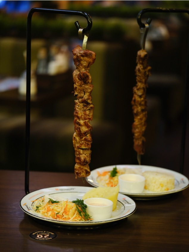 ウズベキスタンをはじめ、放牧が盛んな国々が集まる中央アジアでは、肉厚な羊肉などを串刺しにして豪快に焼き上げる料理、シャシリクが有名です。そんなシャシリクを名物にした全国的チェーンレストランがこちら。串焼き肉は、好みの部位やソースを選んで注文できます。写真は豚のシャシリク529P。
