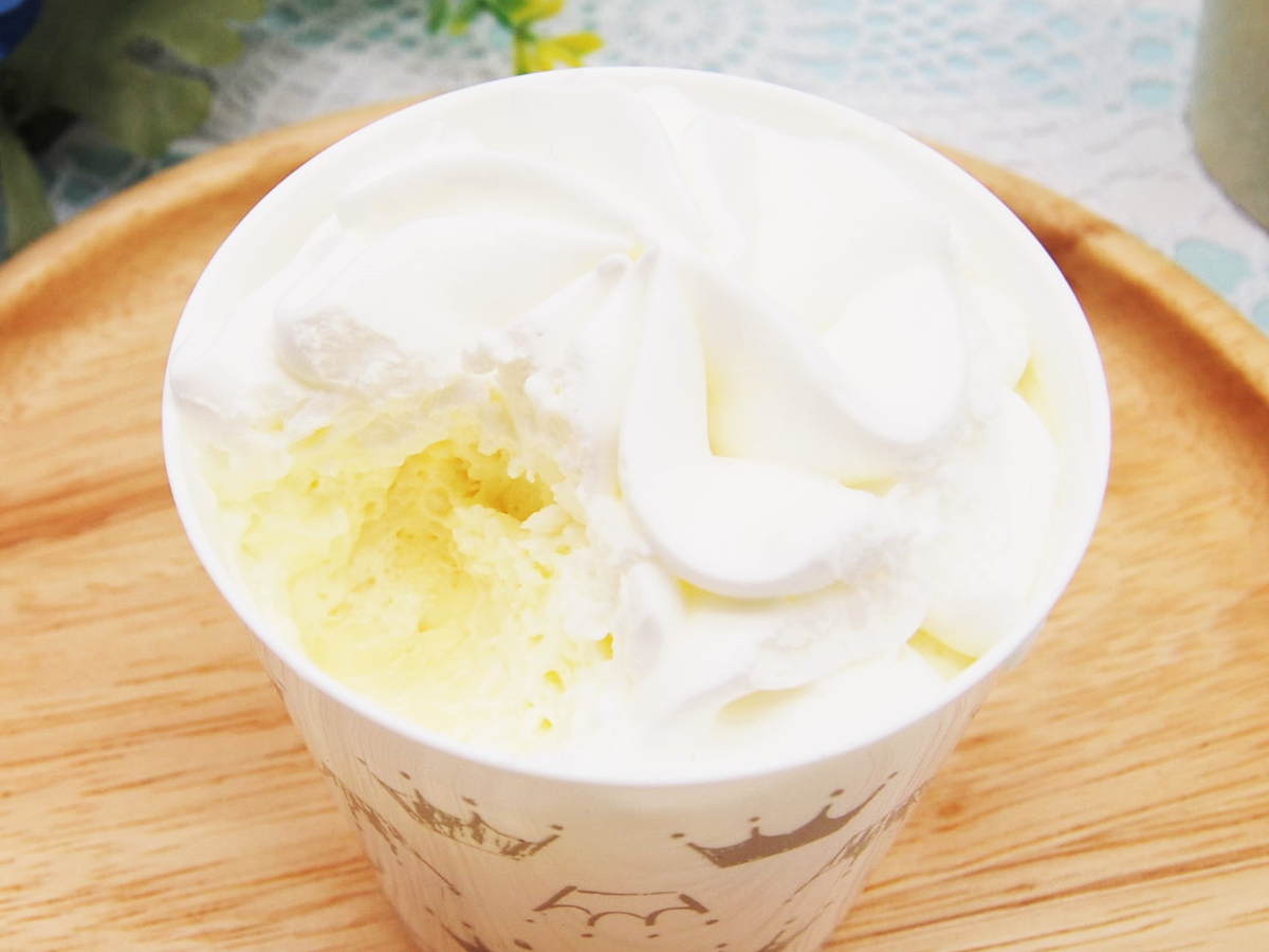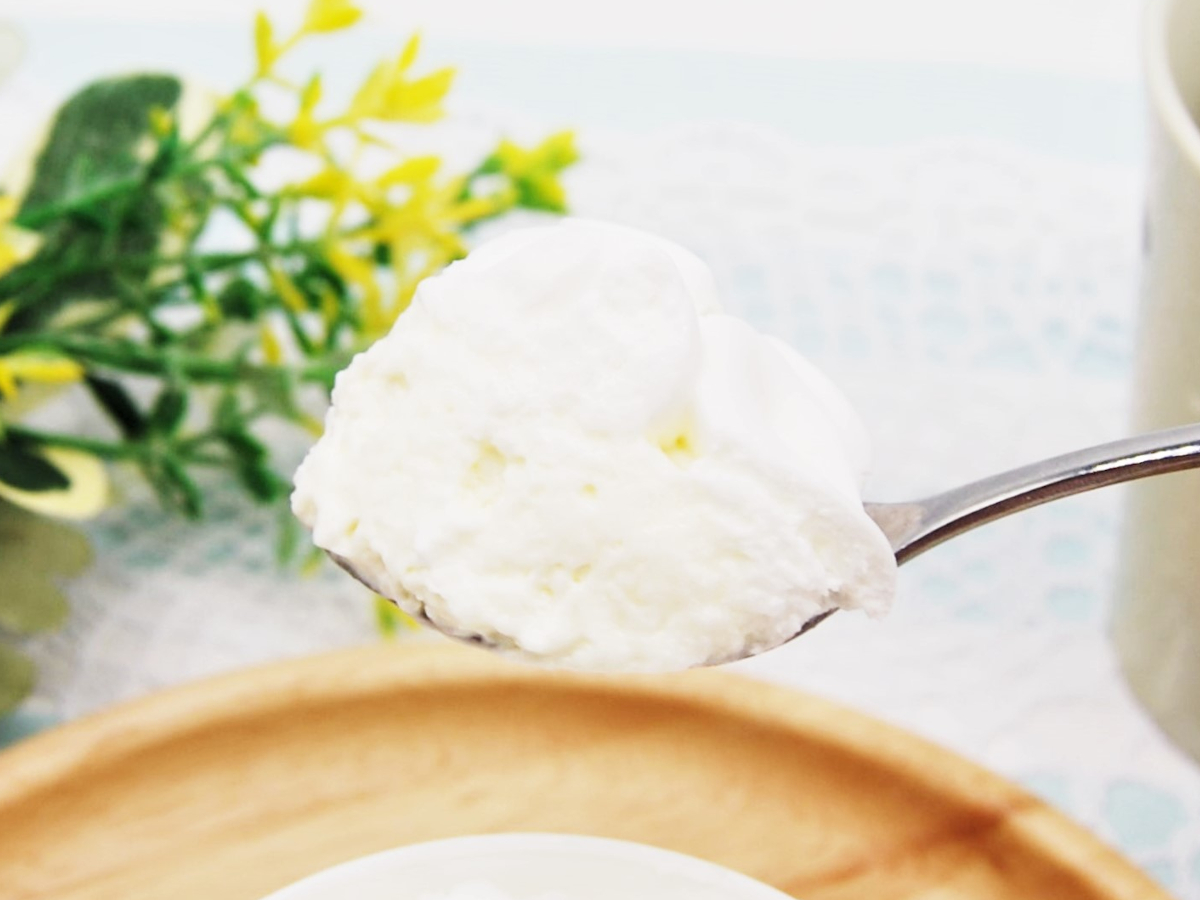表面にトッピングされたクリームチーズは、メレンゲのような軽い食感。口の中に含んだ瞬間、シュワッと消えていきます。後からレモン果汁の酸味が広がるため、想像以上に爽やかな口当たり。チーズケーキというネーミングですが、ヨーグルトに近いテイストです。