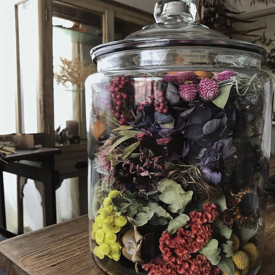 ガラスの透明な瓶に詰めるだけでも素敵インテリアの完成。花首や葉を外から見えるようにただ積み重ねていくだけ。折れてしまった花首も、有効活用できますよ。